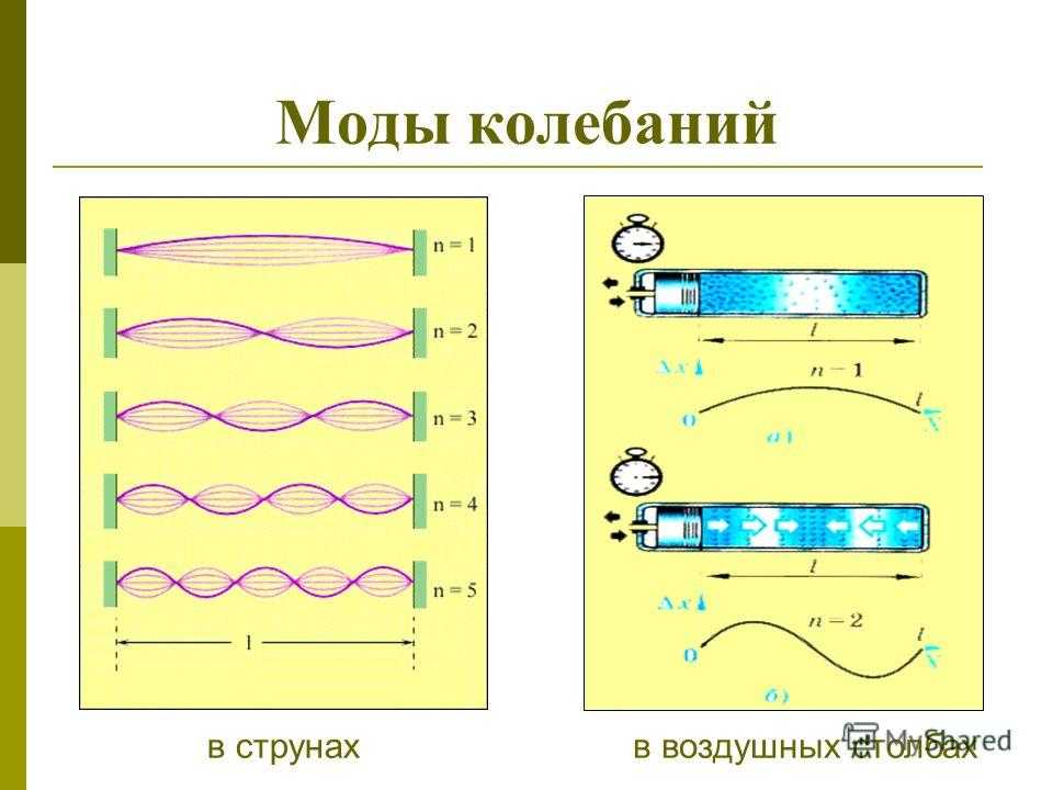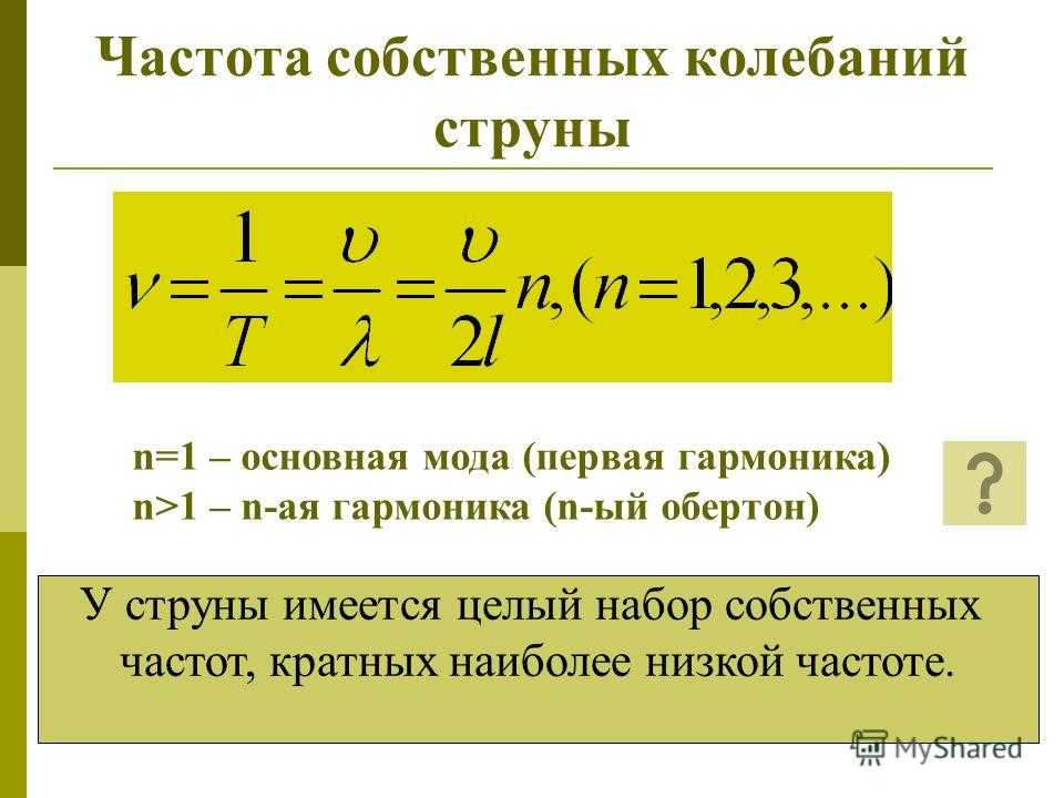 Частота собственных колебаний струны n=1 – основная мода (первая гармоника) n>1 – n-ая гармоника (n-ый обертон) У струны имеется целый набор собственных частот, кратных наиболее низкой частоте.