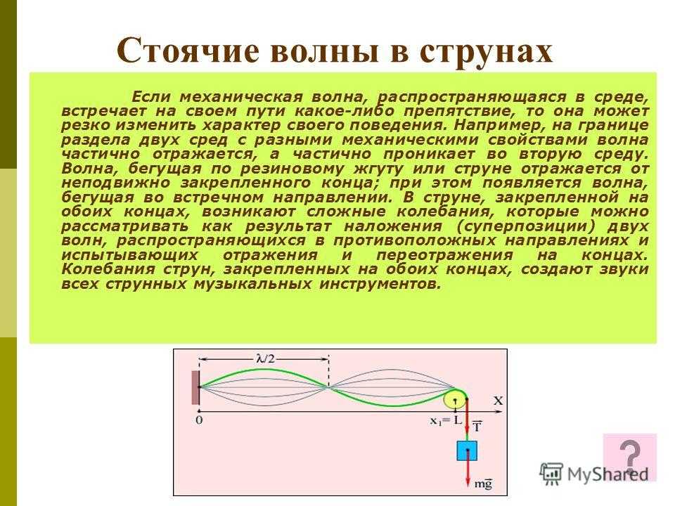 Стоячие волны в струнах Если механическая волна, распространяющаяся в среде, встречает на своем пути какое-либо препятствие, то она может резко изменить характер своего поведения. Например, на границе раздела двух сред с разными механическими свойствами волна частично отражается, а частично проникает во вторую среду. Волна, бегущая по резиновому жгуту или струне отражается от неподвижно закрепленного конца; при этом появляется волна, бегущая во встречном направлении. В струне, закрепленной на обоих концах, возникают сложные колебания, которые можно рассматривать как результат наложения (суперпозиции) двух волн, распространяющихся в противоположных направлениях и испытывающих отражения и переотражения на концах. Колебания струн, закрепленных на обоих концах, создают звуки всех струнных музыкальных инструментов.