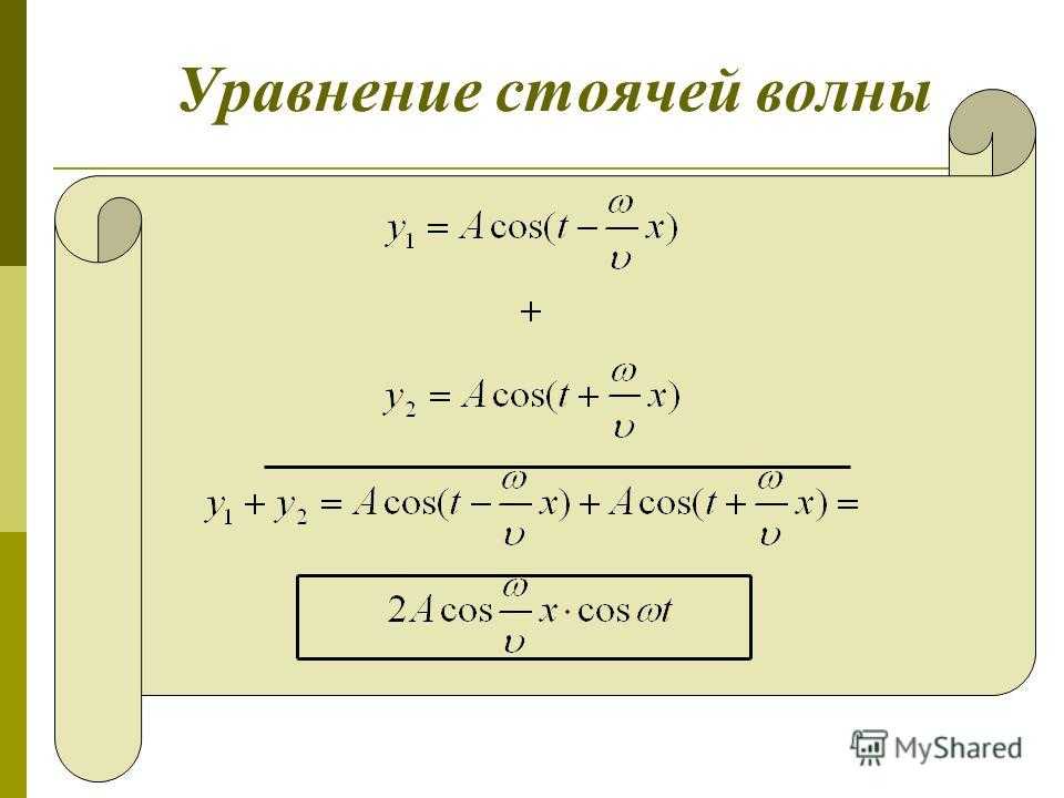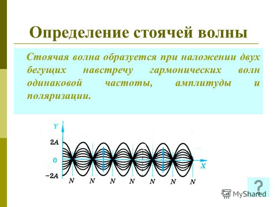 Определение стоячей волны Стоячая волна образуется при наложении двух бегущих навстречу гармонических волн одинаковой частоты, амплитуды и поляризации.