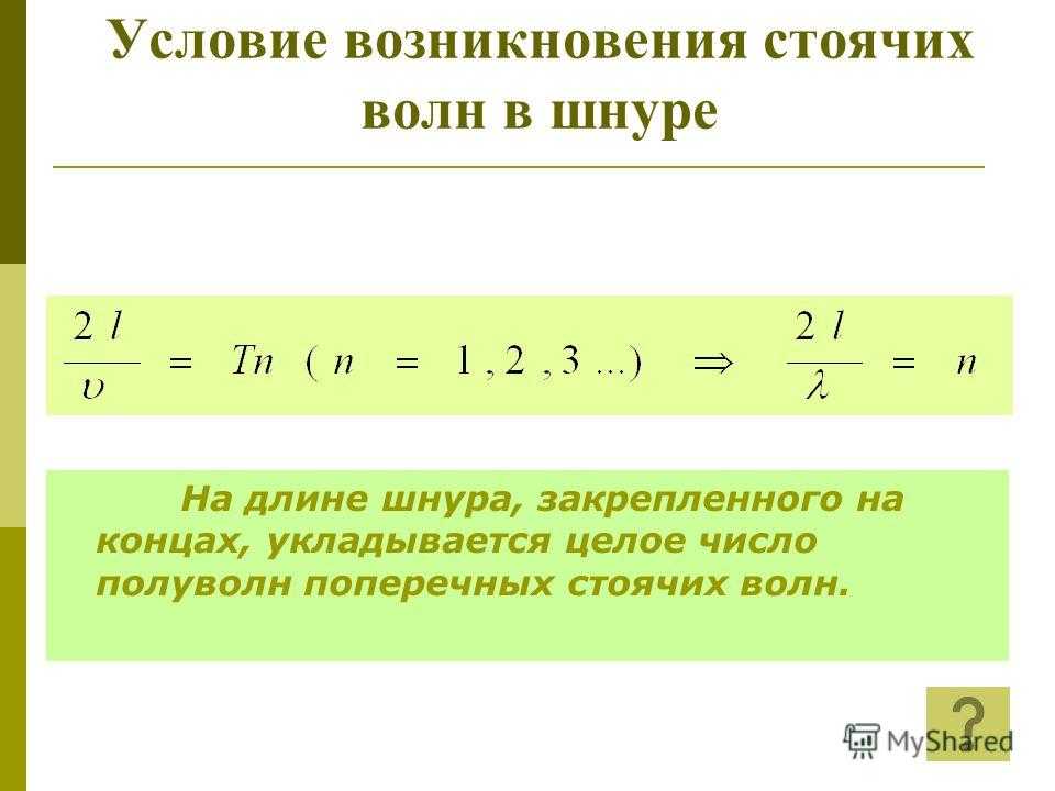 Условие возникновения стоячих волн в шнуре На длине шнура, закрепленного на концах, укладывается целое число полуволн поперечных стоячих волн.