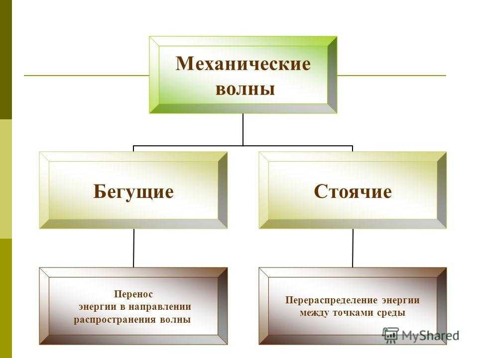 Механические волны Бегущие Перенос энергии в направлении распространения волны Стоячие Перераспределение энергии между точками среды