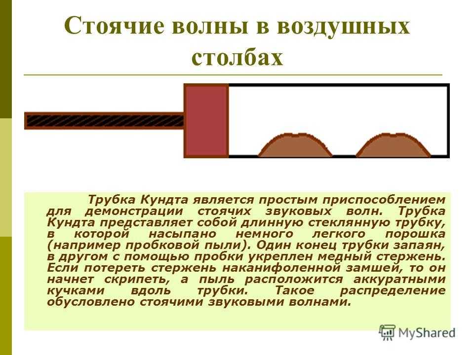 Стоячие волны в воздушных столбах Трубка Кундта является простым приспособлением для демонстрации стоячих звуковых волн. Трубка Кундта представляет собой длинную стеклянную трубку, в которой насыпано немного легкого порошка (например пробковой пыли). Один конец трубки запаян, в другом с помощью пробки укреплен медный стержень. Если потереть стержень наканифоленной замшей, то он начнет скрипеть, а пыль расположится аккуратными кучками вдоль трубки. Такое распределение обусловлено стоячими звуковыми волнами.