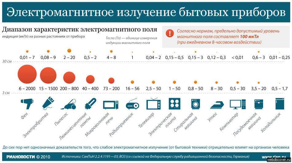 Глядя на эту таблицу, можно для себя уяснить, что чем дальше от человека располагается источник излучения, тем меньше его вредоносное влияние на организм. Если фен находится в непосредственной близости от головы, и его воздействие наносит ощутимый вред человеку, то холодильник практически никак не влияет на наше здоровье.