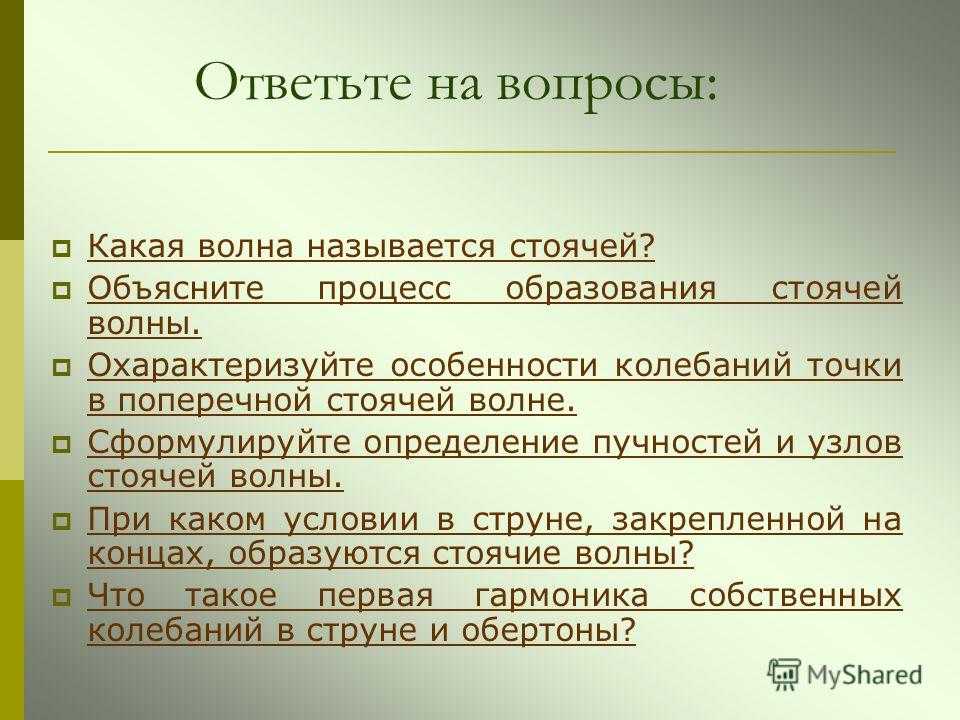 Ответьте на вопросы: Какая волна называется стоячей? Какая волна называется стоячей? Объясните процесс образования стоячей волны. Объясните процесс образования стоячей волны. Охарактеризуйте особенности колебаний точки в поперечной стоячей волне. Охарактеризуйте особенности колебаний точки в поперечной стоячей волне. Сформулируйте определение пучностей и узлов стоячей волны. Сформулируйте определение пучностей и узлов стоячей волны. При каком условии в струне, закрепленной на концах, образуются стоячие волны? При каком условии в струне, закрепленной на концах, образуются стоячие волны? Что такое первая гармоника собственных колебаний в струне и обертоны? Что такое первая гармоника собственных колебаний в струне и обертоны?