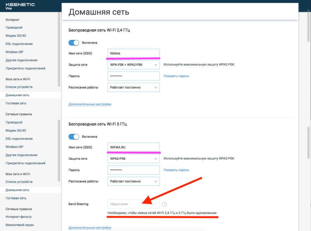 Если же сделать SSID на 2.4 и на 5 ГГц разными, то Band Steering будет недоступен для работы.