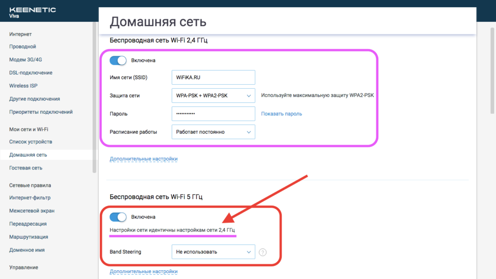 То есть одновременно создаются две сети 2.4 ГГц и 5 ГГц с одинаковым названием и паролем. И роутер в соответствии со своими алгоритмами перекидывает клиентов между ними.