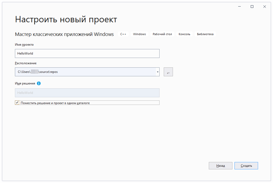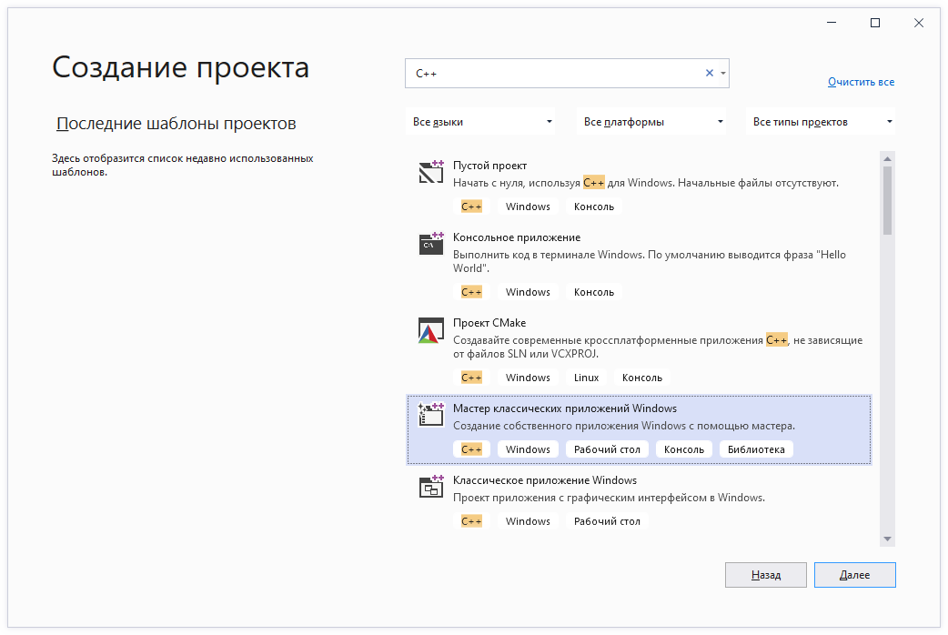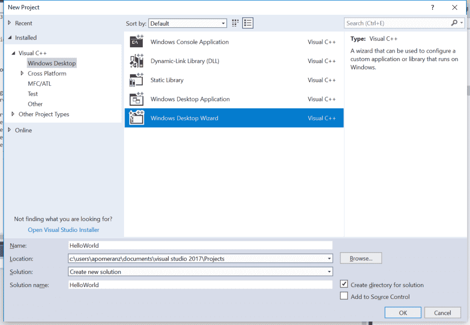 Если вы используете Visual Studio 2017 v15.3 или новее, под Visual C++ выберите Windows Desktop, а затем выберите Windows Desktop Wizard в главном окне.