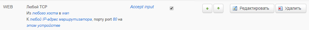 Например откроем порт 80 для получения доступа к WEB-интерфейсу роутера.