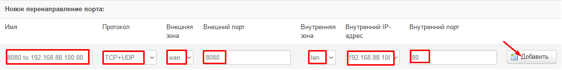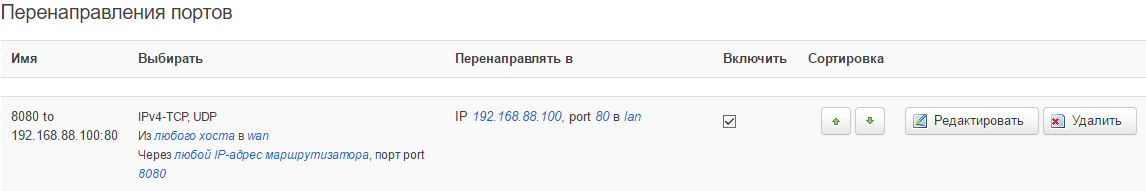 Например перенаправим запросы с внешнего порта 8080 к локальному ПК с IP 192.168.88.100 и его порту 80