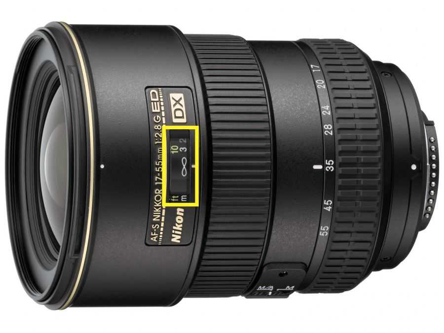 Вот посмотрите на эту фотографию. Тут показано, как настроить на бесконечность по такой шкале объектив Nikon 17-55mm f/2.8G ED-IF AF-S DX Zoom-Nikkor. Значение «бесконечность» обозначается символом “∞”, который совмещен с соответствующей отметкой на оправе объектива.