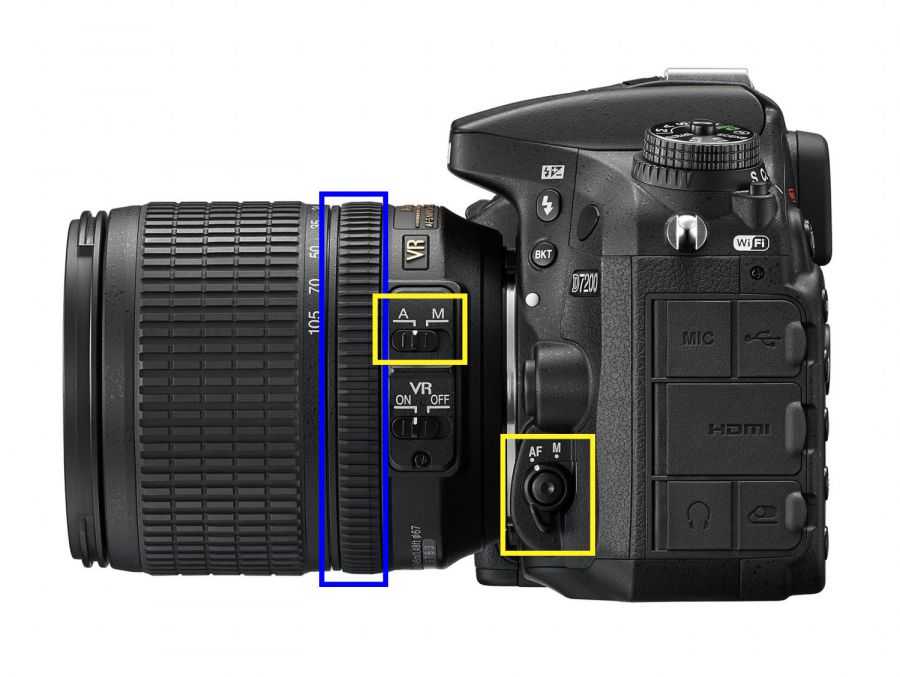 А вот на более совершенных фотокамерах, таких, как Nikon D7200 и выше по этой линейке имеются два переключателя фокусировки. Один из этих переключателей расположен точно так же как и в предыдущем случае, на объективе, второй – на камере. Как ими пользоваться правильно? В случае, если на вашем фотоаппарате стоит объектив AF-S, в котором установлен ультразвуковой привод автофокусировки (так устроены большинство объективов Nikon), то для отключения автофокуса вам нужно будет перевести в положение М один переключатель, тот, который расположен на объективе.