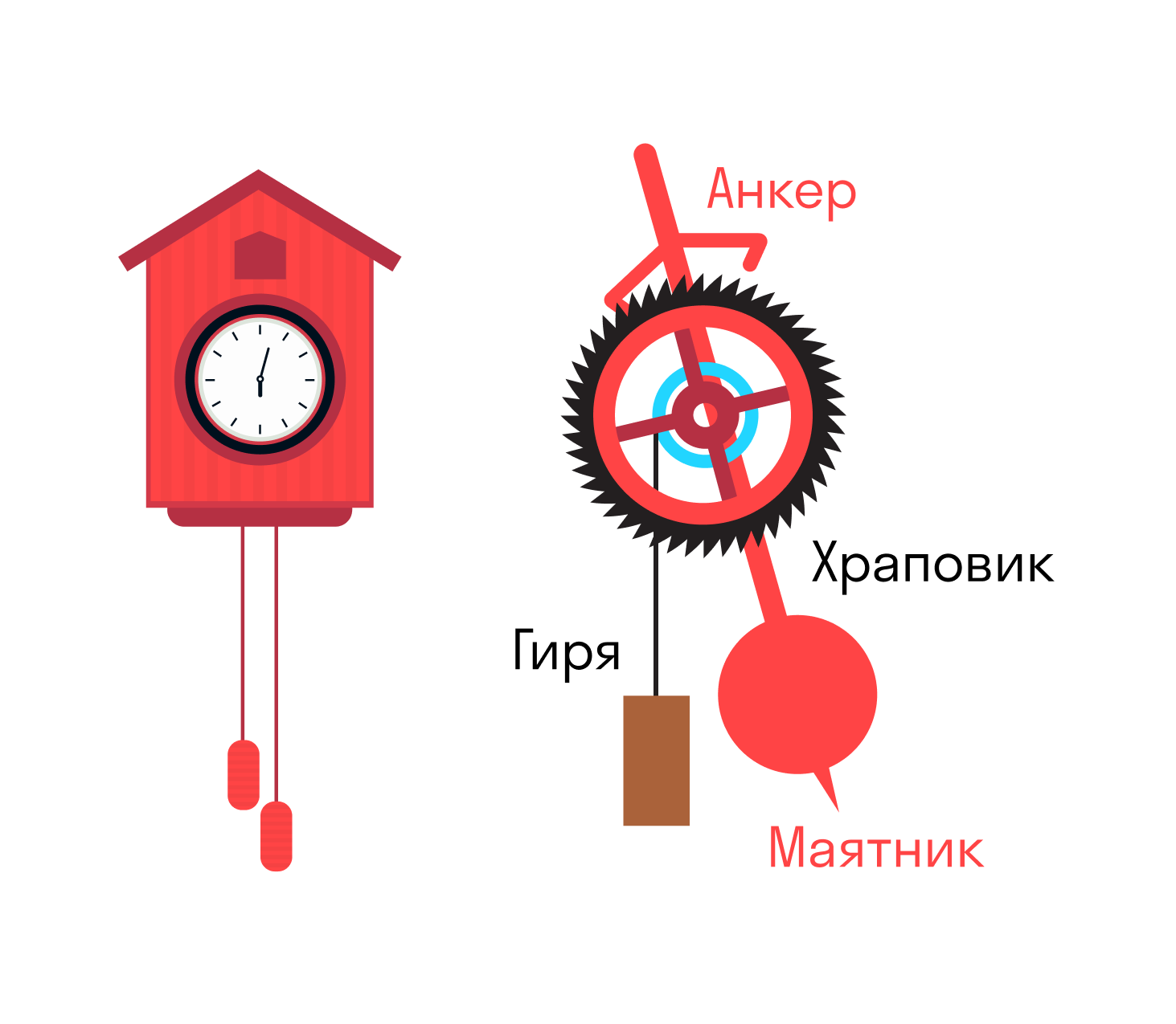 Например, часы с кукушкой — пример автоколебательной системы. Гиря на ниточке (цепочке) стремится вращать зубчатое колесо (храповик). При колебаниях маятника анкер цепляет за зубец, и вращение приостанавливается.