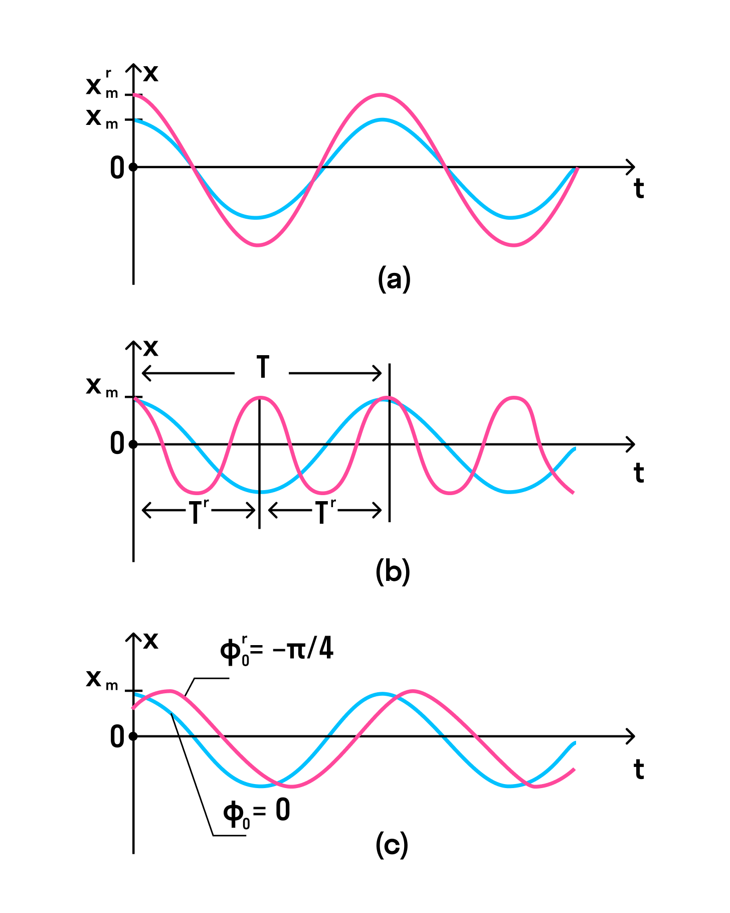 На рисунке ниже во всех трех случаях для синих кривых начальная фаза равна нулю, а в последнем (с) — красная кривая имеет меньшую начальную фазу.