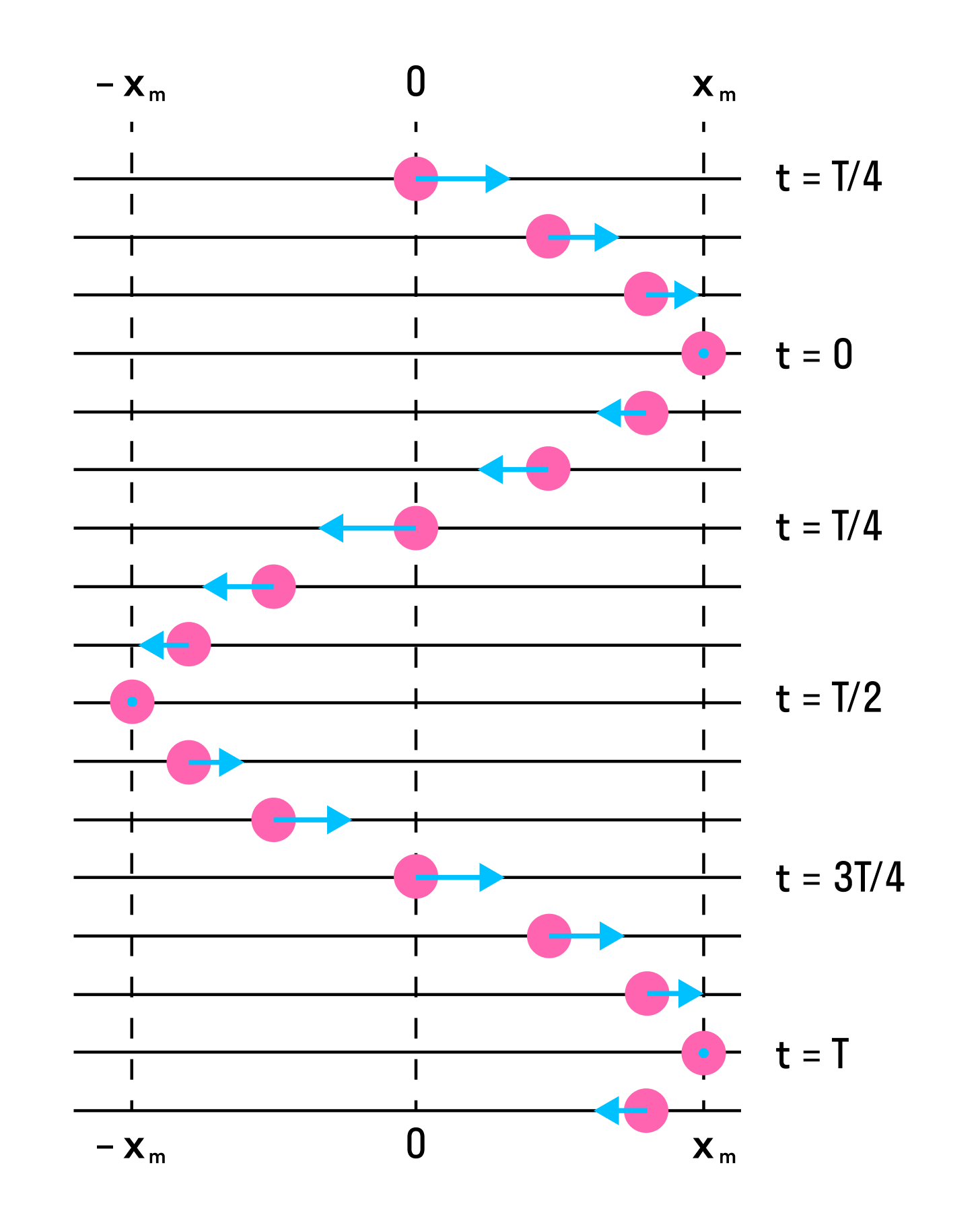 На рисунке ниже показаны положения тела через одинаковые промежутки времени при гармонических колебаниях. Такую картину можно получить при освещении колеблющегося тела короткими периодическими вспышками света (стробоскопическое освещение). Стрелки изображают векторы скорости тела в различные моменты времени.