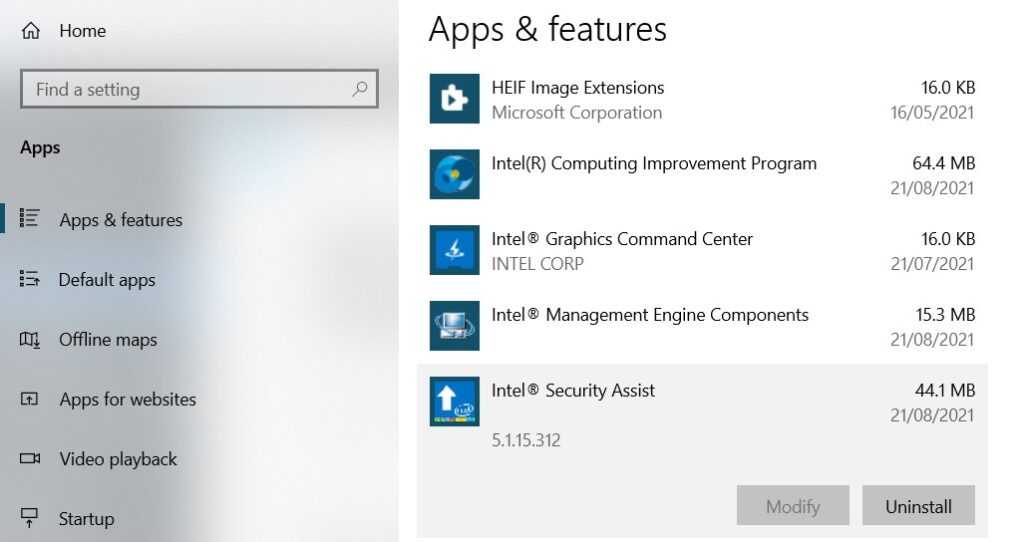 - Нажмите на Intel Security Assist и выберите Удалить.