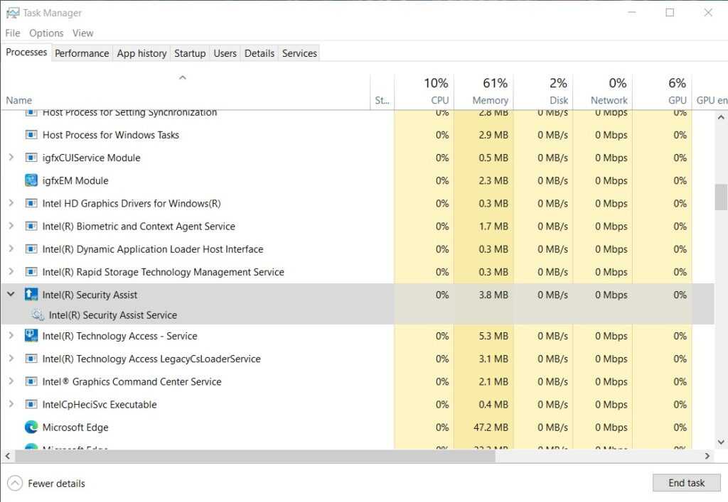 - Open task manager and verify ‘intel Security Assist’ is running in the ‘processes’ tab