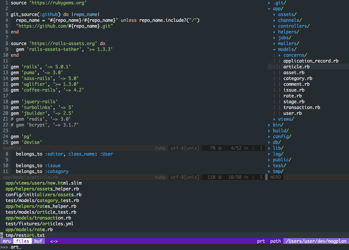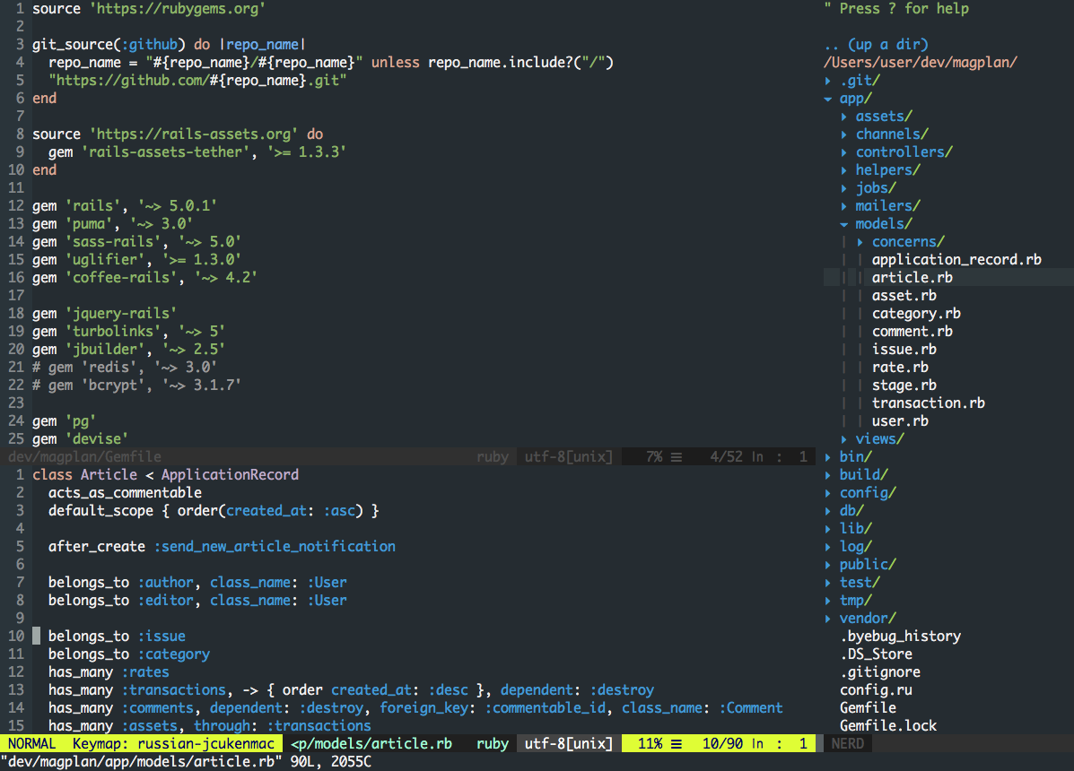 Must-have-панель со статусной информацией по текущему открытому файлу. Наверняка ты видел ее в большинстве скриншотов Vim в интернете — плагин очень популярен. Панель интерактивная, показывает текущий режим работы, раскладку, кодировку, позицию курсора в файле, строке и многое другое.