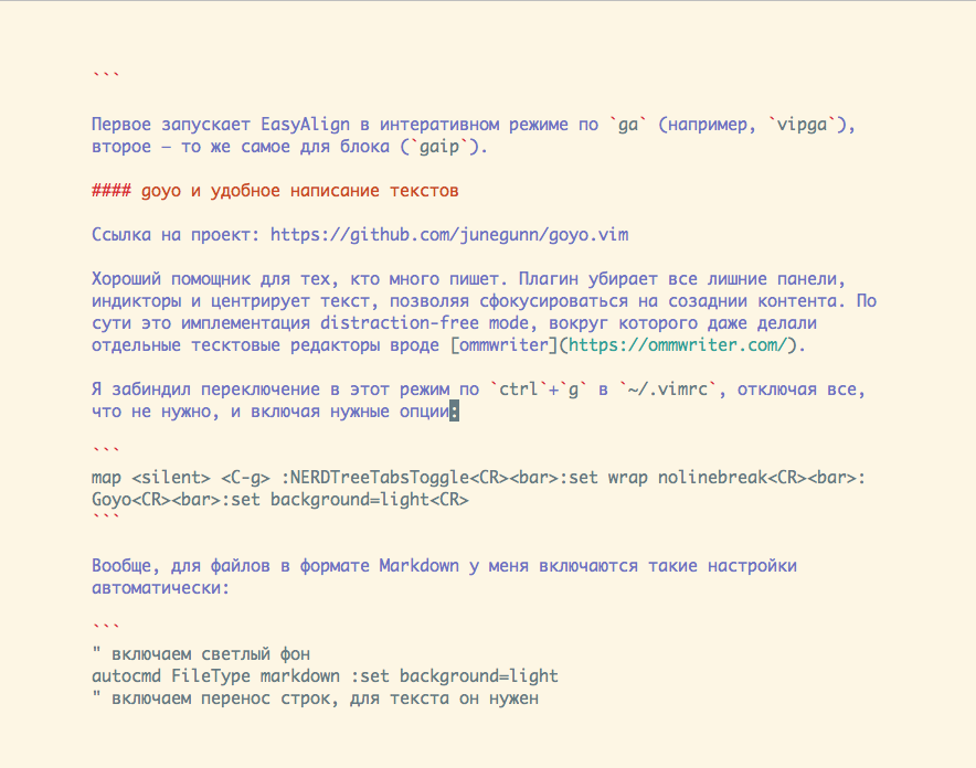 Плагин рисует линии отступа в коде, помогая отслеживать вложенность. Раньше я использовал vim-indent-guides, но его глюки меня порядком достали. Плагин indentLine работает вроде бы получше.