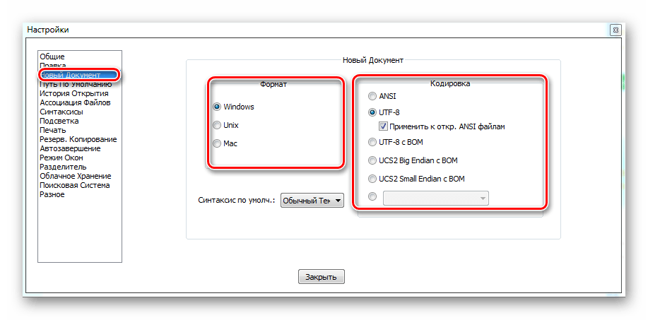 Несмотря на то, что Notepad++ поддерживает множество кодировок. При выборе пункта «Новый документ» вы можете по умолчанию установить ту, с которой работаете чаще всего, а также формат каждого нового файла. При начале работы стоит убрать галочку с кнопки «Применить при открывании ANSI файла». Это нужно для того, чтобы при каждом открытии он не перекодировался.