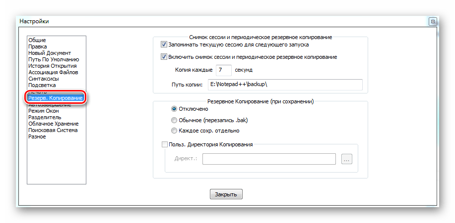 Позволяет настроить время сохранения сессии. Изначально эта функция уже работает. При желании можно установить время каждого копирования, а также то, куда будут сохраняться эти файлы. Еще вы можете активировать резервное копирование при сохранении. Тогда эти снимки будут складываться в отдельную папку и при каждом сохранении будет создаваться новая копия.