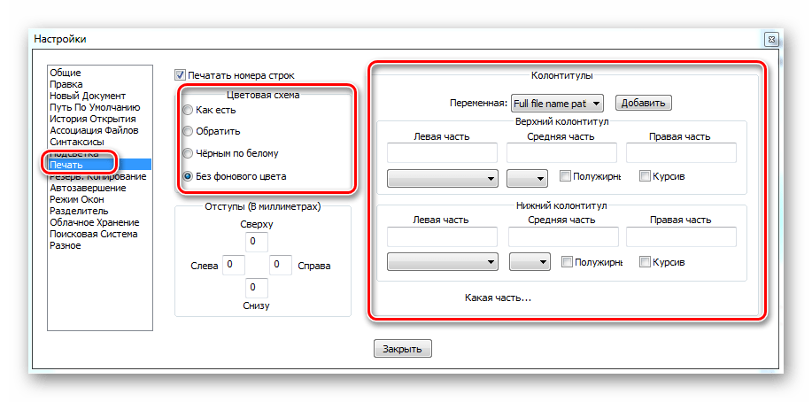 Раздел «Печать» поможет вам скорректировать то, как будут выглядеть документы для распечатки. Здесь можно регулировать особенности шрифта, отступы, номера строк и различные цветовые схемы страницы.