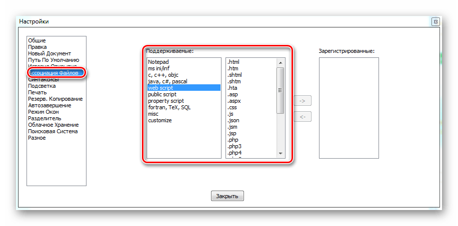 Вкладка «Ассоциация файлов» необходима для настройки имеющихся значений расширения файлов, которые программа может открывать в автоматическом режиме.