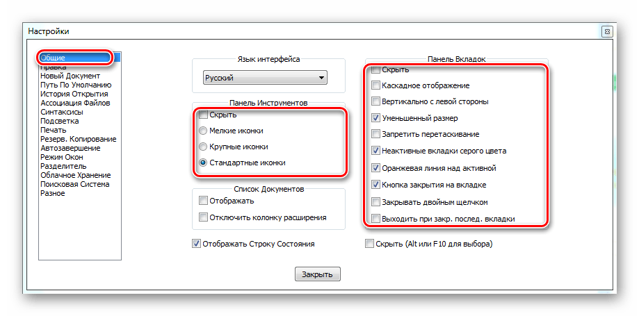 Здесь вы можете управлять такими функциями как подсветка парных тегов, вид переключенных документов, обработка веб-ссылок и т.д. Здесь также можно отключить автоматические обновления Нотпада, а также настроить расширение файла и то, как он будет сворачиваться.