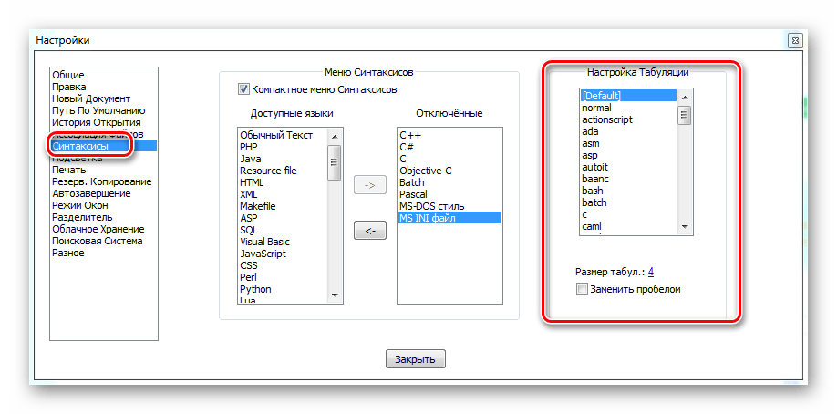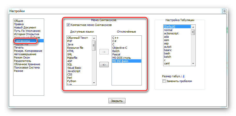 Раздел «Меню Синтаксиса» нужен для того, чтобы отключить из меню выбора те языки, которыми вы не пользуетесь. Если необходимо — их можно будет включить обратно.