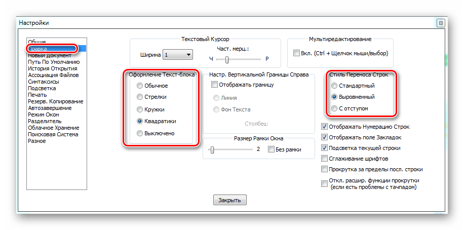 В разделе «Правка» можно настроить оформление вашей рабочей области. Здесь вы можете подстроить под себя курсор, подсветку строк и оформление текстовых блоков.