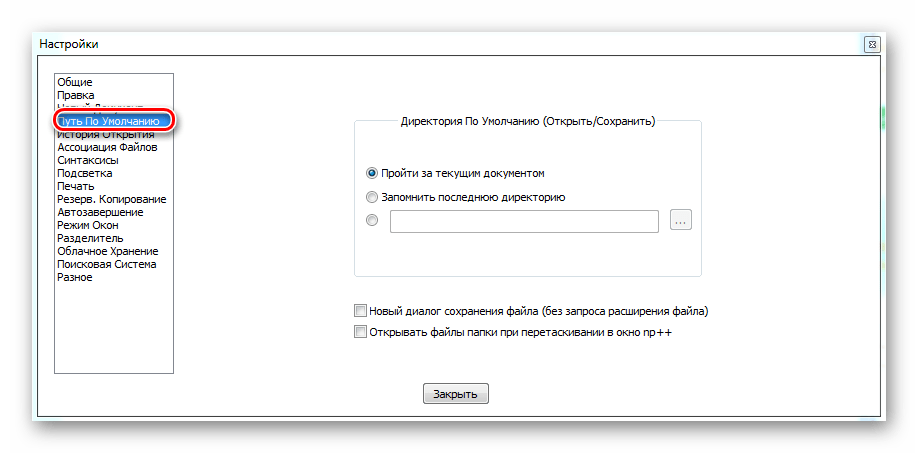 Здесь пользователь задает директорию, куда Notepad++ сохранит документ. Это очень удобно, если вы пишете объемную программу и каждую часть кода необходимо складывать в одну папку. Впрочем, если вы не выберете, куда сохранять файлы, то приложение само предложит вам ту директорию, которая использовалась в последний раз.