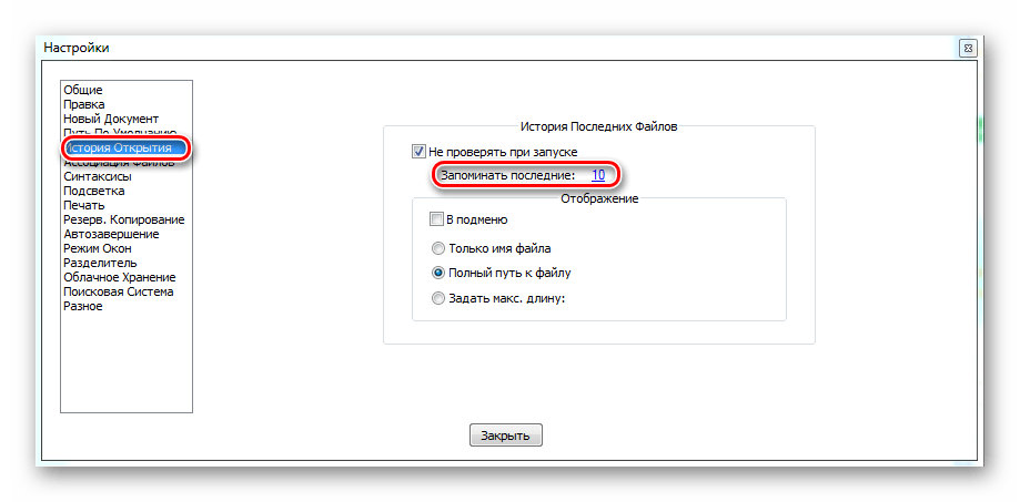 - «История Открытия» позволяет настроить то количество последних открытых файлов, которое вам необходимо. Программа будет автоматически запоминать их.