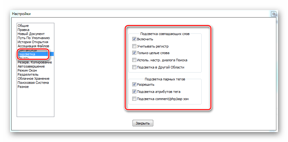 «Подсветка» позволяет вам устанавливать как будут подсвечиваться отдельные слова и парные теги.