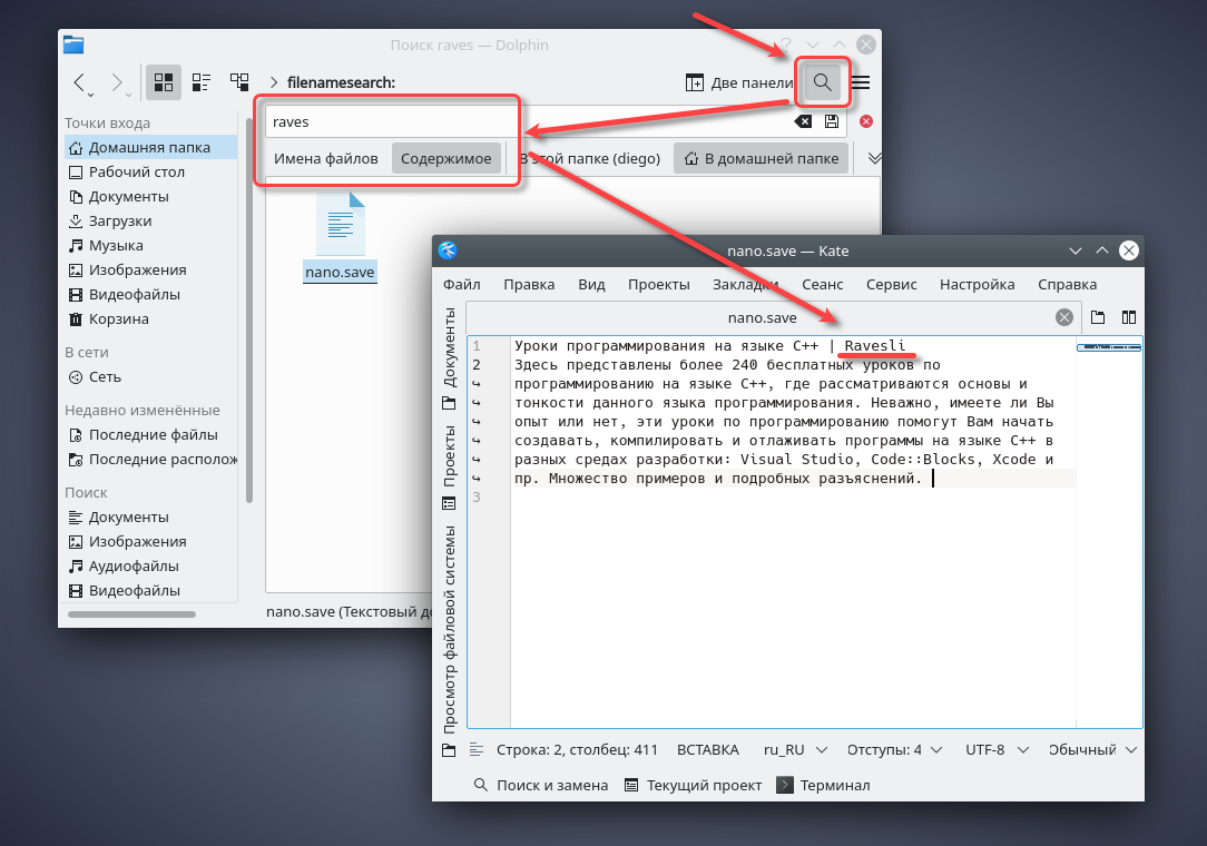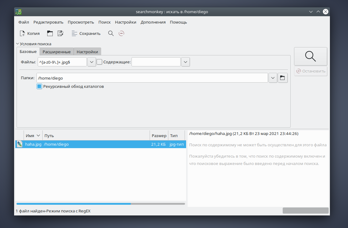 Многие файловые менеджеры также предоставляют возможности поиска файлов. Например, в Dolphin для запуска поиска достаточно просто нажать кнопку со значком лупы, а затем ввести имя файла (или папки) в строку поиска. При этом вы можете выбрать папку, в которой будет выполняться поиск, а также указать дополнительные параметры (поиск по содержимому и пр.). Помимо этого в качестве поискового запроса допускается применять символы и :