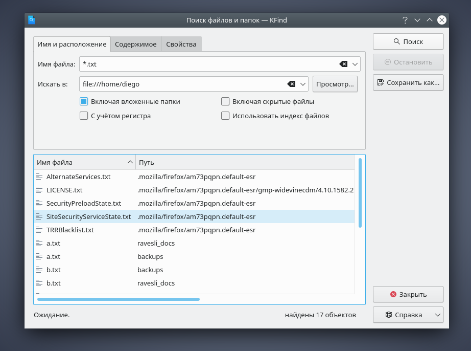 В KDE, помимо вышеупомянутых инструментов поиска, также есть замечательная утилита под названием KFind. С её помощью вы можете точно настроить параметры поиска (указать имя файла, его тип и путь поиска, обычный текстовый поиск или мета-поиск, дату изменения, размер, пользователя, группу и пр.). Она также позволяет сохранять результаты поиска в виде простого текстового списка URL-адресов найденных файлов: