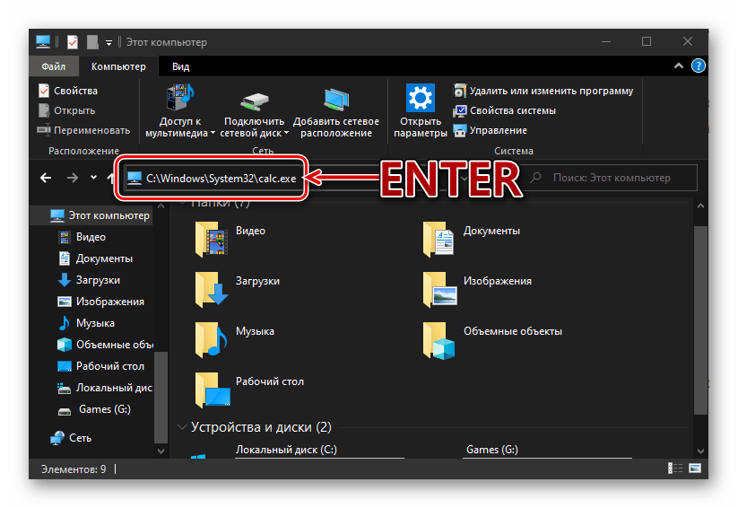 Если нужно инициировать его непосредственный запуск, скопируйте указанный выше путь, вставьте его в адресную строку «Проводника» (можно открыть клавишами «WIN+E» или через контекстное меню кнопки «Пуск») и нажмите «ENTER». Если же требуется получить доступ к исполняемому файлу приложения, в файловом менеджере перейдите на шаг выше – в расположение C:WindowsSystem32 , а далее уже самостоятельно отыщите в этой директории calc.exe.