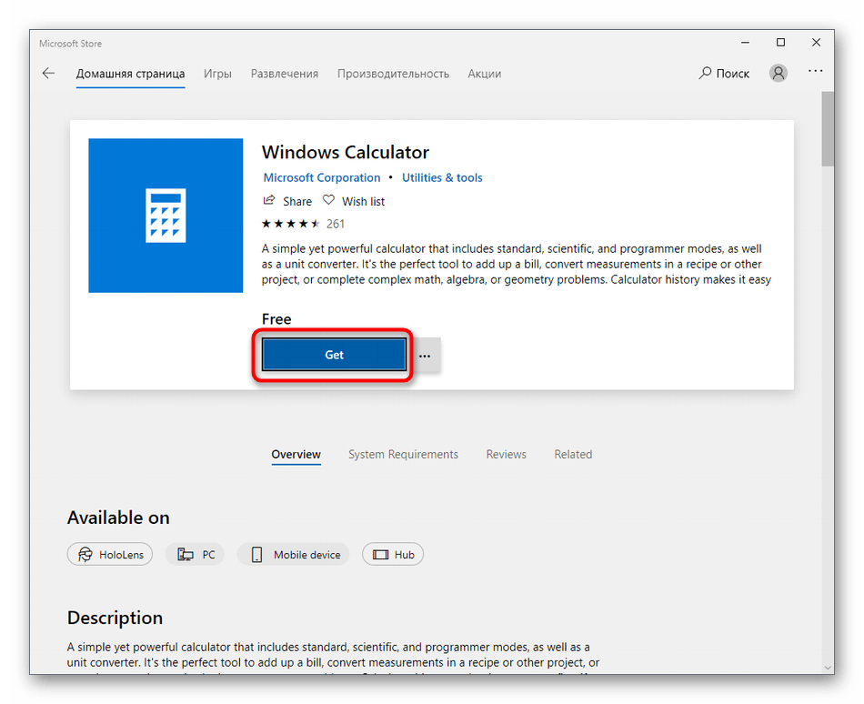 - Введите в поисковую строку запрос «Калькулятор». Магазин предложит вам список бесплатных приложений, среди них будет и стандартный калькулятор. Выберите его и кликните по кнопке «Получить», чтобы начать установку.Выбираем калькулятор и устанавливаем его