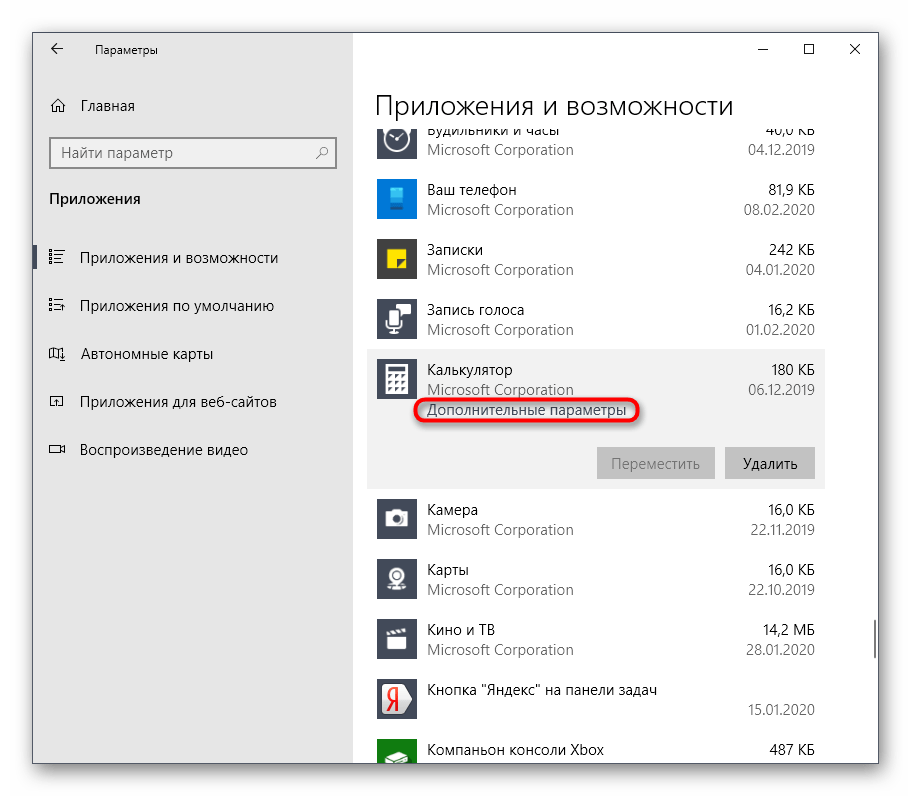 - В новом окошке находим программу «Калькулятор» и кликнем на ссылку под ней «Дополнительные параметры»;