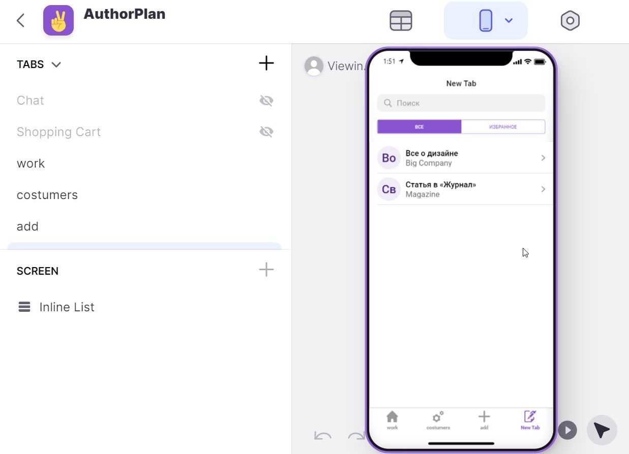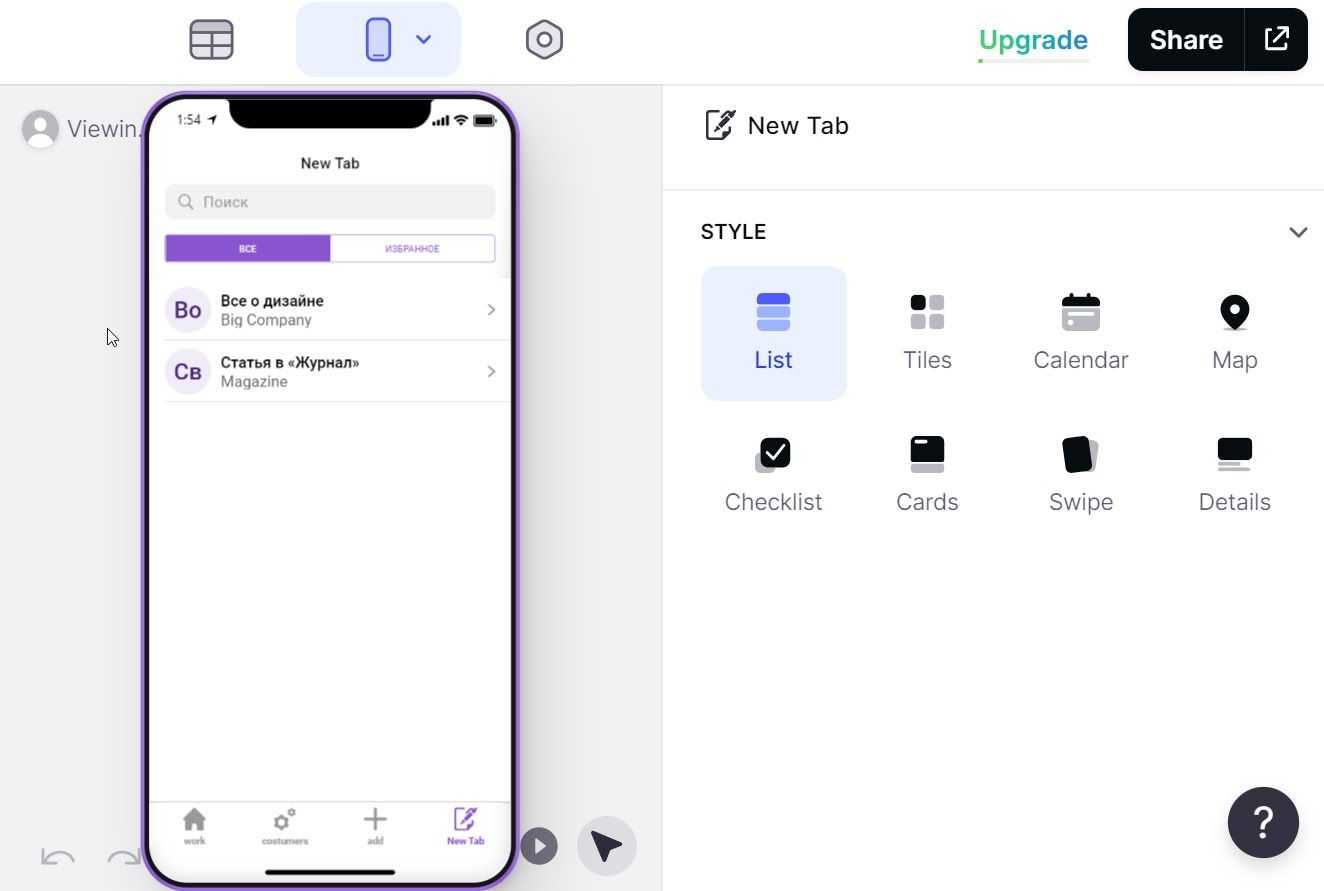 Шаг 2. Когда таблицы сформированы и БД подключена, создаем вкладки в разделе TABS. Для каждой вкладки определяем название, иконку, источник данных (один из листов в таблице) и стиль. Приложение отображается в виде эмуляции телефонного экрана: iPhone или смартфона на Android. Между вкладками можно переключаться прямо там.