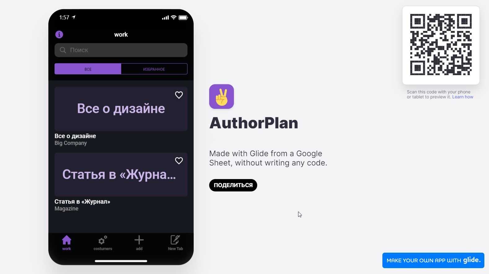 Шаг 4. Заключительный этап — публикация приложения. В бесплатной версии проект хостится на домене glideapp.io с QR-кодом для скачивания
