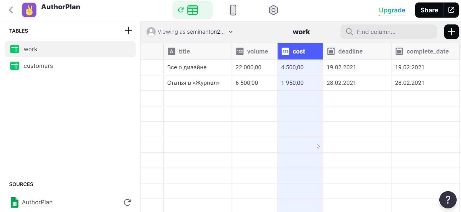 Шаг 1. Сначала заполняем таблицу данными. Сделать это можно в Google или непосредственно в Glide. Формат простой: первая строка — название свойства, а все, что ниже — данные. Редактируем данные и создаем новые таблицы там же. Внешне напоминает MySQL или аналогичную СУБД.
