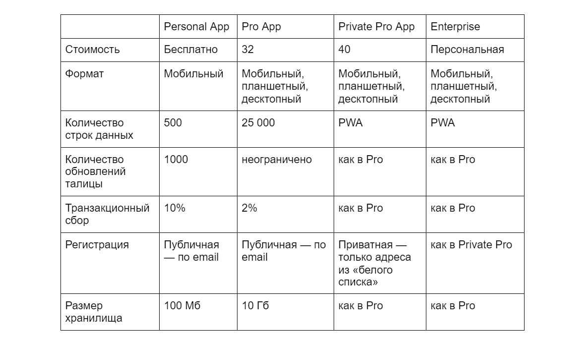 Тарифная сетка в Glide — гибкая и демократичная. Цена популярного плана Pro App составляет всего 32$. При этом он позволяет размещать проект на пользовательском домене, подключать Google Analytics и Zapier.