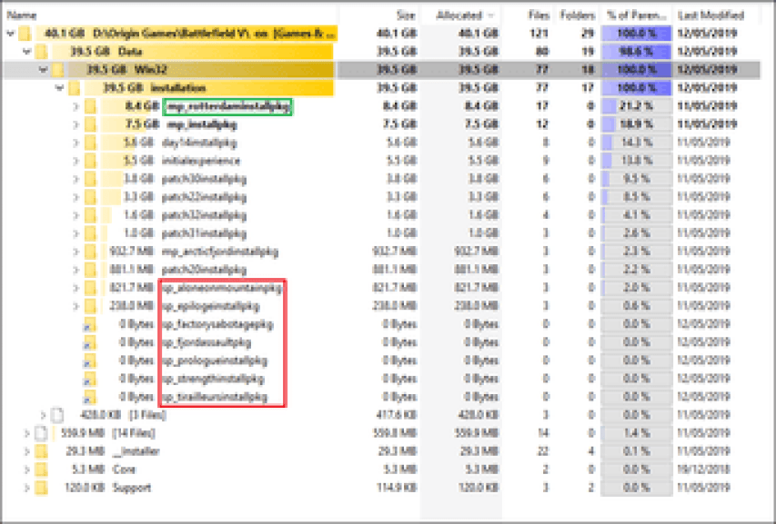 На приведенном выше снимке экрана вы можете увидеть файлы, соответствующие названиям однопользовательских миссий и многопользовательским картам в Battlefield V. Я переместил файлы, соответствующие однопользовательским миссиям, на более медленный жесткий диск, поскольку я редко играю в одиночную игру.