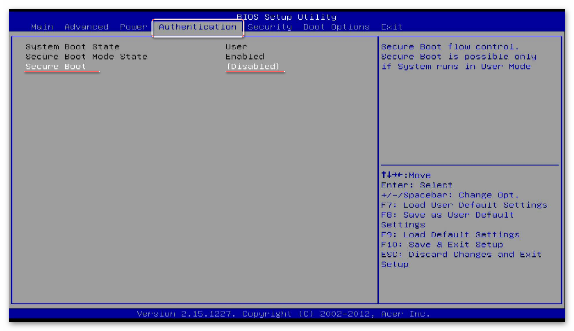 - Повторно войдите в BIOS с использованием пароля и перейдите в раздел «Authentication», что в верхнем меню.