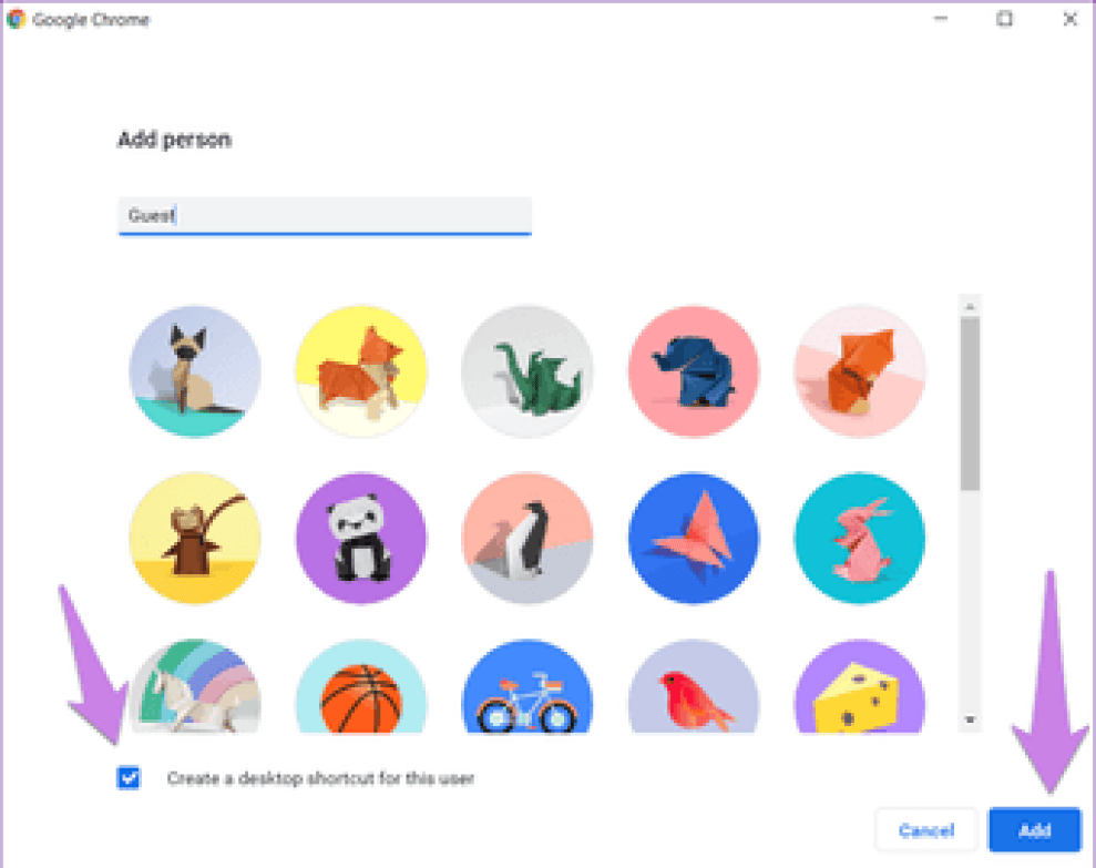 Шаг 3: Введите имя профиля. Вы можете назвать это гостем. Выберите нужный значок из списка. Установите флажок «Создать ярлык на рабочем столе для этого пользователя». Затем нажмите Добавить.