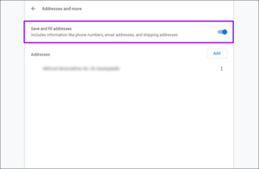В разделе «Адрес и прочее» есть переключатель «Сохранить и заполнить адреса». Включите его, чтобы начать автоматическое заполнение ранее сохраненных адресов и сохранять (и автоматически заполнять) новые адреса.