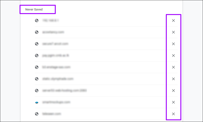 Проблемы с автозаполнением, связанные с паролями, также могут возникнуть, если вы запретили Chrome сохранять учетные данные для входа на определенные сайты. Прокрутите список паролей до раздела «Никогда не сохранялись» — затем вы можете удалить сайты, которые Chrome должен снова сохранять (и автоматически заполнять).