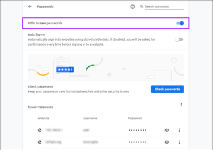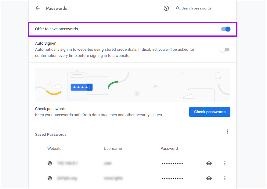В разделе «Пароли» есть переключатель «Предлагать сохранение паролей» — убедитесь, что он включен. В противном случае Chrome не сохранит ваши учетные данные, что не позволит браузеру автоматически заполнить их.