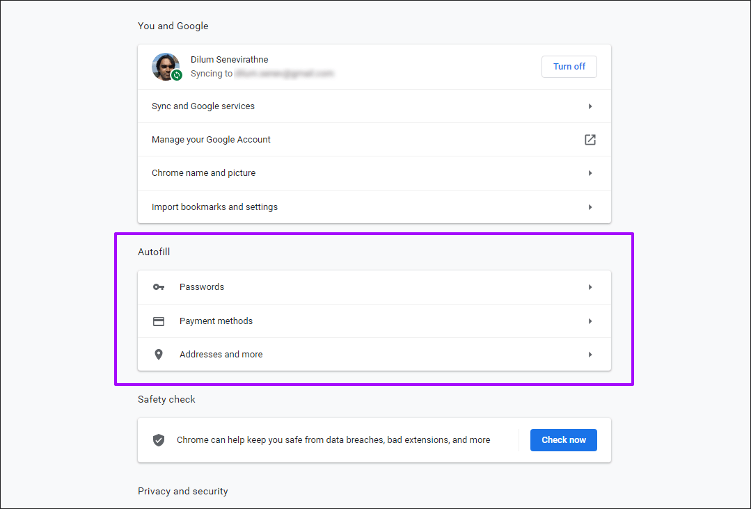 Далее: просмотрите настройки автозаполнения. Chrome автоматически вводит три категории данных: пароли, способы оплаты и адреса. Всегда полезно проверить, правильно ли настроено автозаполнение для любого или всех из них.