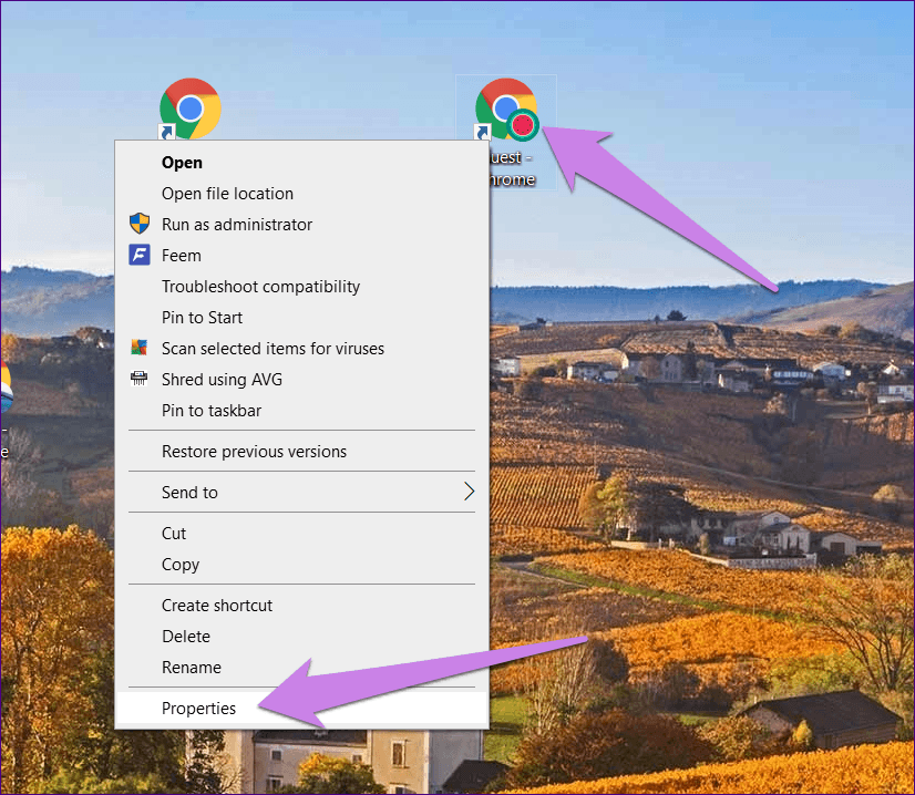 Как только это будет сделано, щелкните правой кнопкой мыши файл ярлыка и выберите Характеристики из контекстного меню.