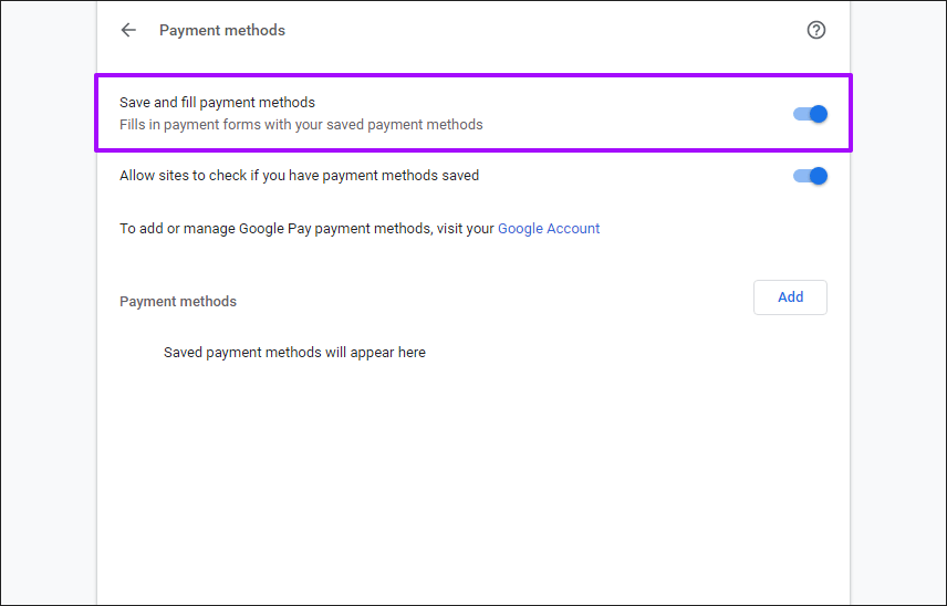 В разделе «Способы оплаты» есть переключатель «Сохранить и заполнить способы оплаты». Вы должны включить его, чтобы начать автоматическое заполнение ранее сохраненных способов оплаты и сохранить (и автоматически заполнить) новые способы оплаты.